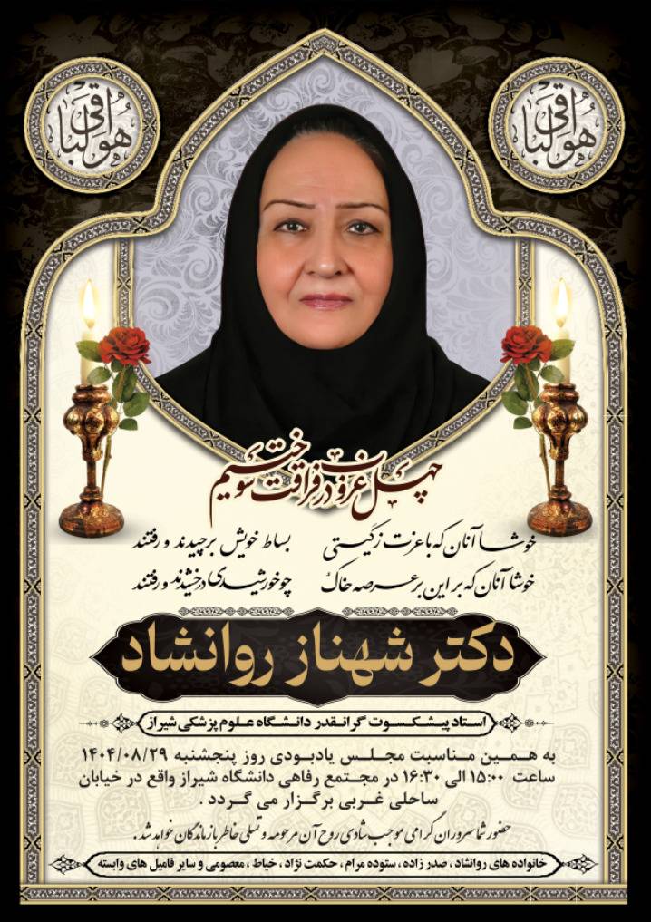با نهایت تأثر و اندوه به اطلاع دوستان، آشنایان و همکاران می‌رسانیم که مراسم ختم زنده‌یاد دکتر شهناز روانشاد، استاد پیشکسوت و گرانقدر دانشگاه علوم پزشکی شیراز، برگزار می‌گردد.